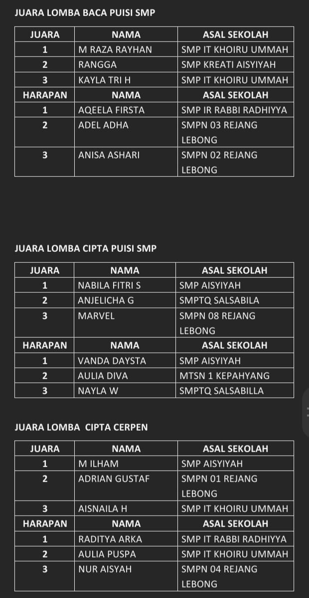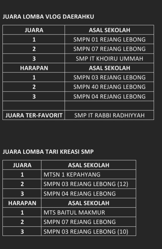 Perlombaan dalam memperingati Bulan Bahasa,Sumpah Pemuda dan Hari Pahlawan ini sukses digelar. Kegiatan ini memperlombahkan 13 mata lomba, dan di ikuti dari tingkat SMP, SD dan Paud / Tk dengan peserta lebih kurang 400 dari Kabupaten Rejang Lebong dan ssekitarnya Perlombaan yang di lombakan pada hari ini ialah lomba baca puisi, bercerita, pidato, cipta puisi, cipta cerpen, vlog daerah, tari kreasi, dan mewarnai.