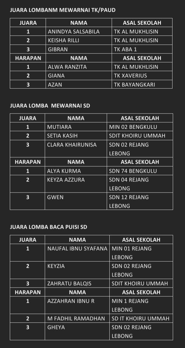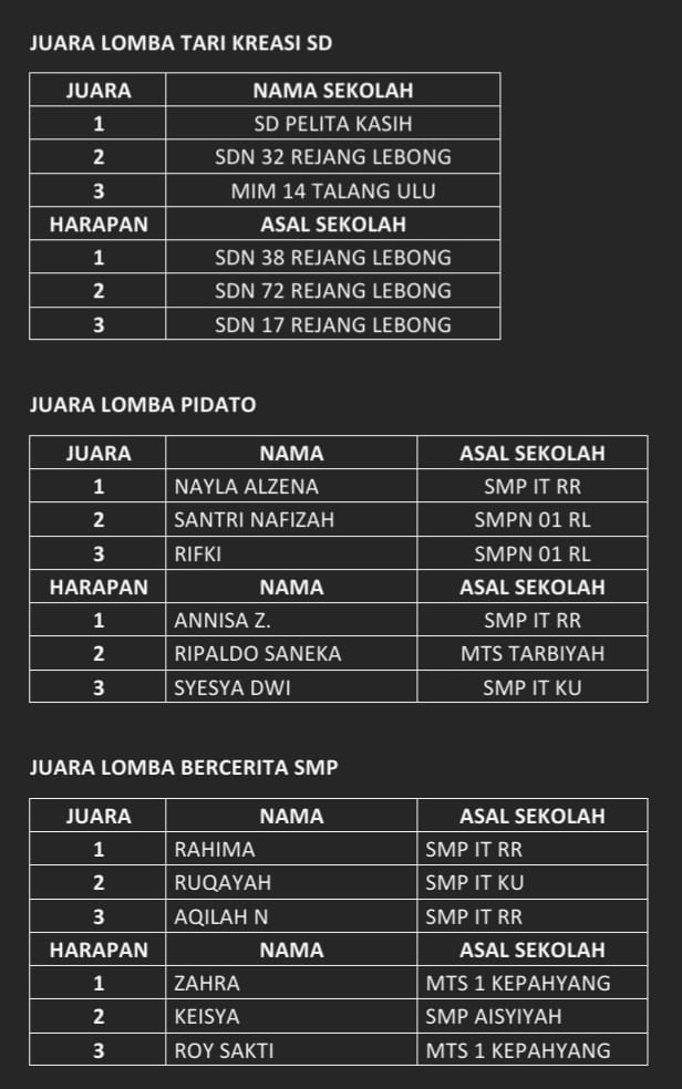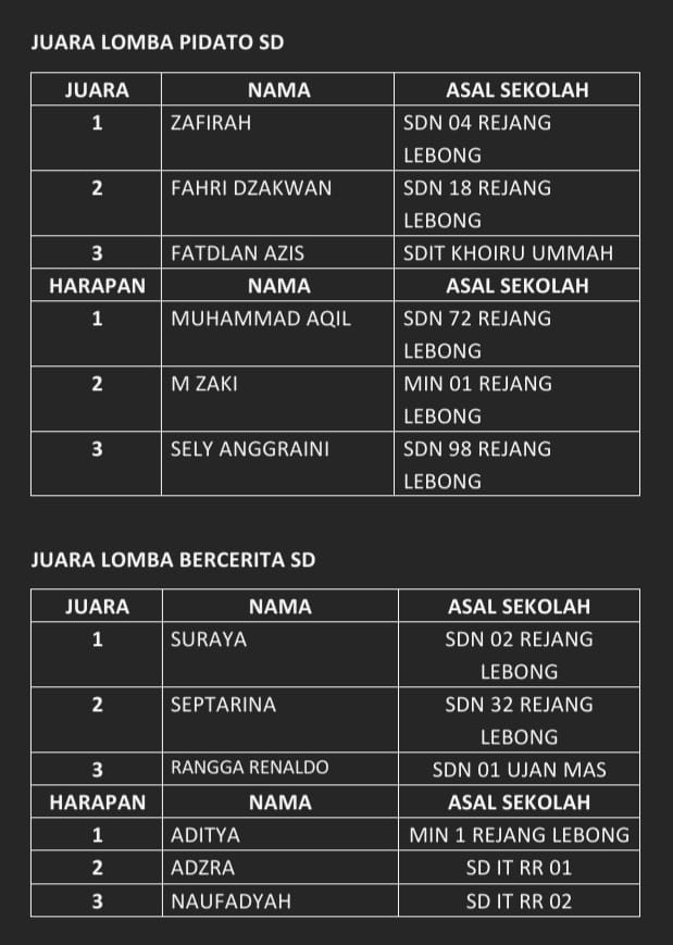 Disamping peserta dari Kabupaten Rejang Lebong ada juga dari kabupaten tetangga seperti Kabupaten Kepahiang, perlombaan ini sebagai ajang bagi anak-anak untuk mengasah bakat dan prestasi, apa lagi baru kali ini diadakan serentak di Kabupaten Rejang Lebong sehingga aura kompotisinya sangat terasa.” pungkas Dony.
